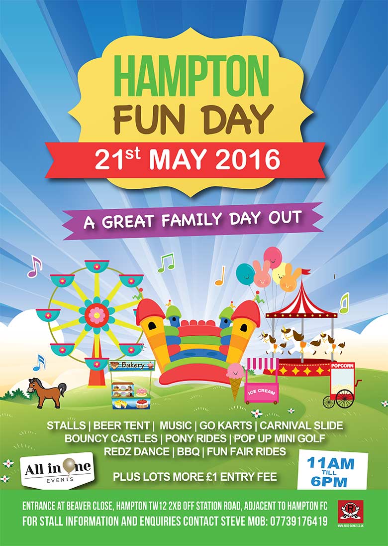 We are bringing back Hampton fun day for the 7th year running. A fun filled day out for all the family to enjoy. There will be bouncy castles, rides, side stalls, face painters, a bar and food up for grabs at this annual fair that we host. Last year was one of our most successful to date with over 3000 people attending throughout the day. We have had such great feedback from everyone with how everyone enjoyed themselves. We are aiming to make it better in 2016!
