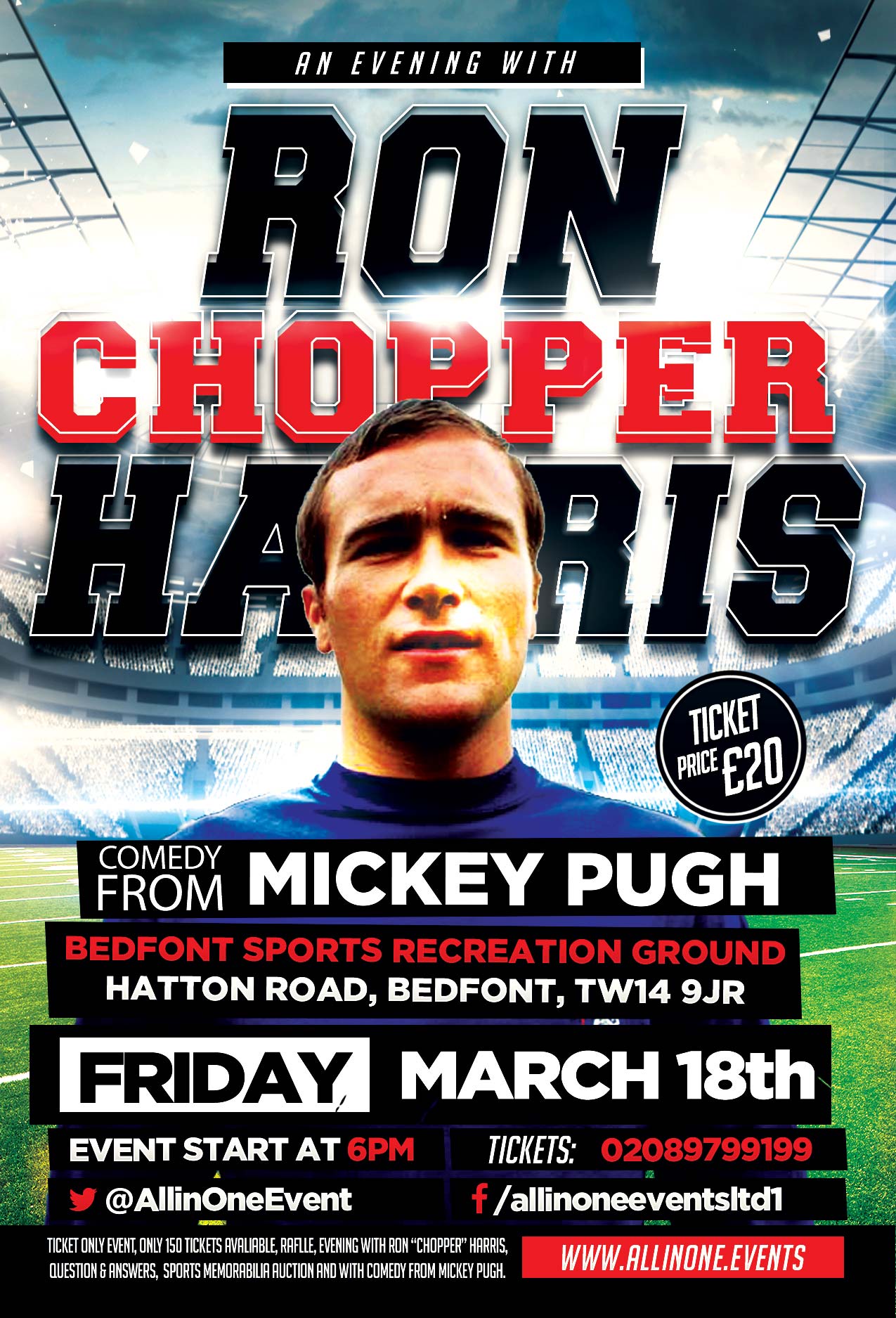 This is for all you loyal Chelsea fans out there. We are hosting an evening with the most capped Chelsea player to date Ron 'Chopper' Harris. Come and meet the player yourself and listen to his stories of the footballing world. There will be a chance for you to ask him questions about his career and have a photograph with him signed. To add to this great evening we will have the great comedian Mickey Pugh who will kick of the evening with some of his acts.